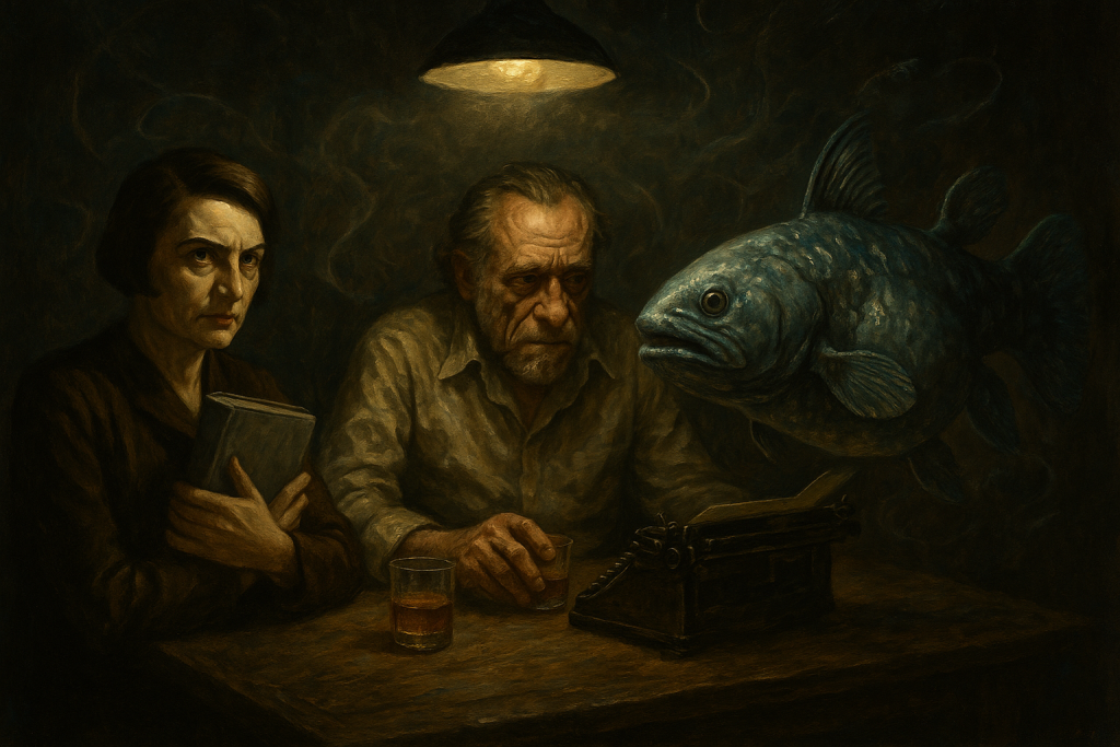 Bukowski: (grins) Listen to her, lady. That fish just wrote better poetry than all your books. And she didn’t even need a martini glass or a marble bust.
